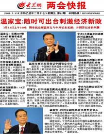 兩會進行時: ·(兩會授權發布)政府工作報告 ·溫家寶:隨時都可提出新的刺激經濟政策 ·溫家寶:最不發達國家不能成為危機中被遺忘的角落 ·溫家寶:應對金融危機要加快改革 保證措施落實