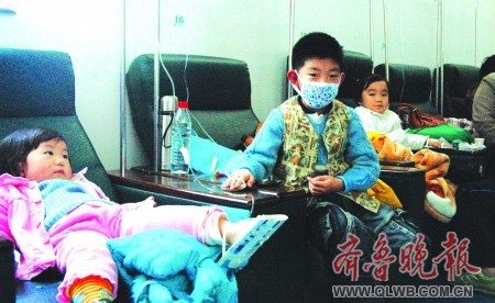 18日,濰坊市人民醫(yī)院,一名輸液的患兒戴上了彩色口罩防控甲流。甲流疫情暴發(fā)后,人們防范甲流的意識日漸增強。醫(yī)生說,戴口罩是防范甲流的一種有效辦法。