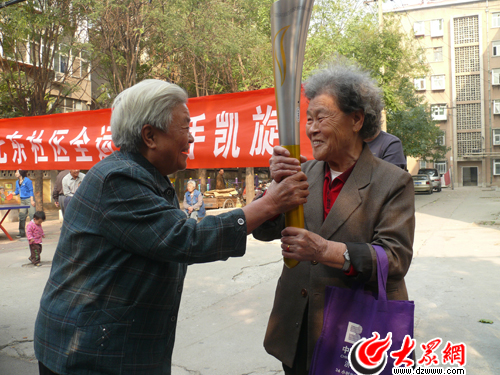 作為社區第一棒,已是75歲高齡的李老太一時間高興地幾乎嘴都合不攏了。當大家問她感覺如何時,她一連說了5個‘高興’。她還向記者表示,她早就期盼著這一天的到來,以前只在電視里看到過火炬傳遞,今天不僅近距離看到了,而且還在手中搖了幾下,覺得自己似乎年輕了許多。