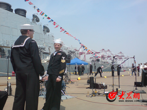 美國海軍同樣以特有的方式展現(xiàn)了他們開放和浪 漫。在軍艦旁邊,美國人將大鼓、音箱等樂器依次排 開,播放著動感的音樂,儼然要辦一個演唱會一般, 在軍艦入口處他們還特意安排了兩個帥氣的士兵和一 個長相甜美的女兵,專門和參觀者合影,其他人除了 安排參觀者登艦,很多都在互相談?wù)撝髯躁P(guān)心的話 題,NBA季后賽和音樂是他們談?wù)撟疃嗟摹E加袇⒂^ 者也跟他們提起NBA,他們很多都會說“YAO!”(姚明)。
