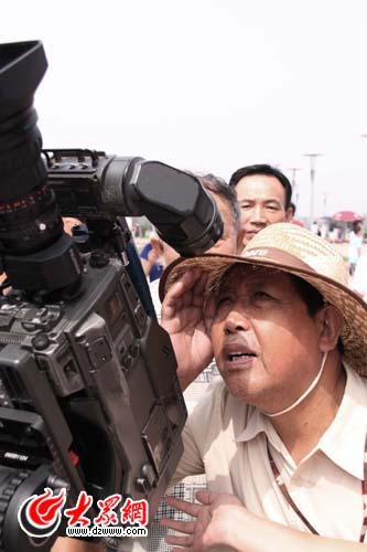 一位老人通過濟南電視臺的攝像機觀看日食