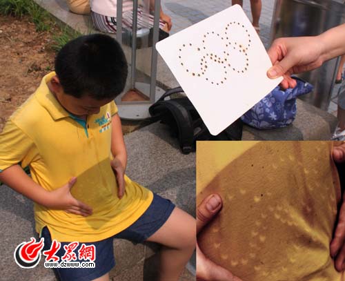 一位市民用自制的五環形狀的小孔,在一位小朋友身上形成一個個“日牙”