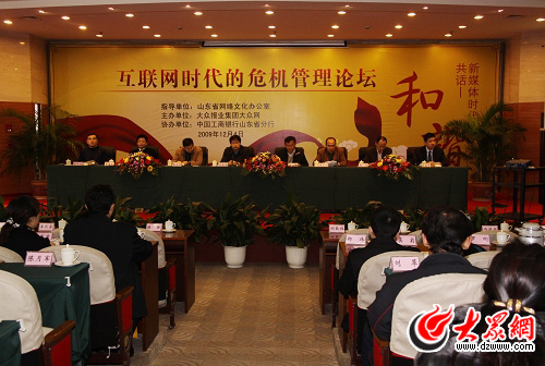 山東省網絡文化辦公室主任劉致福出席本次論壇,中央財經大學危機管理學院執行院長董傳儀,人民網副總裁官建文、搜狐網總編室主任魏成和百度網公關事務部高級經理趙承分別就危機管理發表專題演講。大眾網總編輯、總經理潘子江主持論壇。