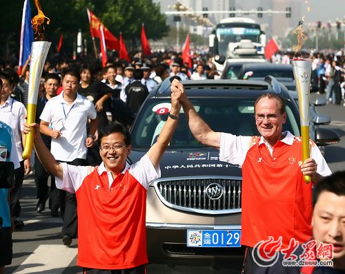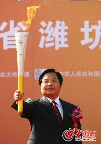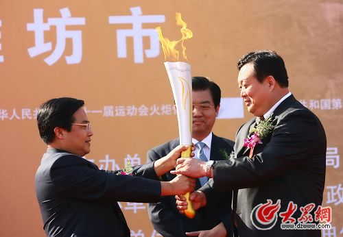 濰坊市委書記張新起將火炬交到市體育局局長耿文手中。