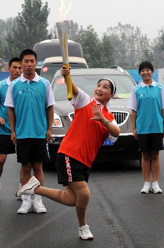 10月8日,火炬手章蘭在傳遞火炬。當日,第十一屆全國運動會火炬傳遞活動在山東聊城進行。