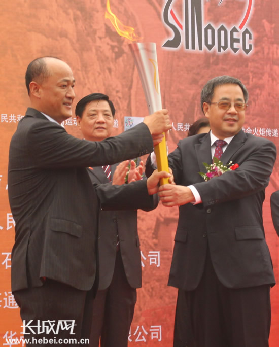 河北省委副書記、省長胡春華(右)將火炬傳授給省體育局局長聶瑞平(左)。
