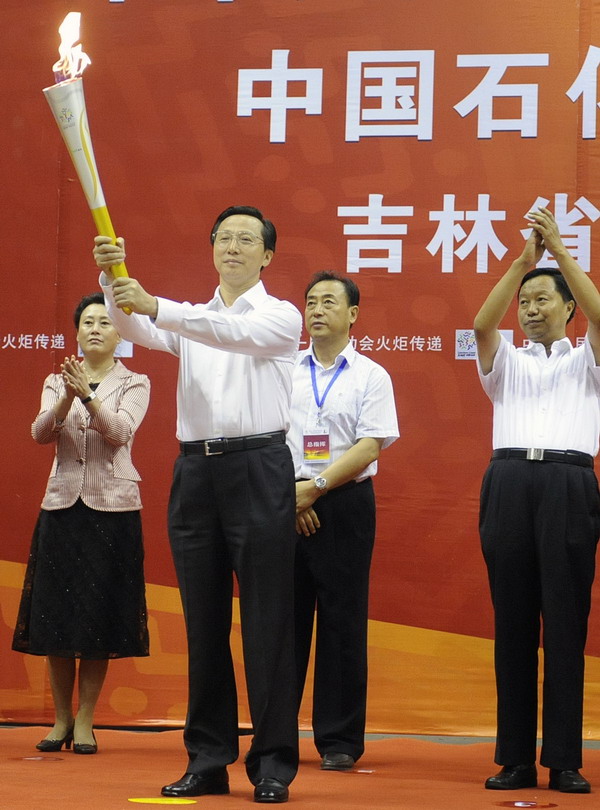 8月20日,吉林省省長韓長賦展示火炬。當日,第十一屆全運會火炬傳遞在吉林省長春市五環體育館完成了第五站的傳遞。