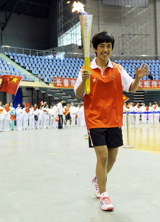 8月20日,第四棒火炬手、世界女子散打冠軍鄂美蝶在火炬傳遞中。當日,第十一屆全運會火炬傳遞在吉林省長春市五環體育館完成了第五站的傳遞。