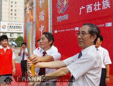 廣西自治區主席馬飚點燃主火炬,將主火炬傳給自治區體育局局長容小寧