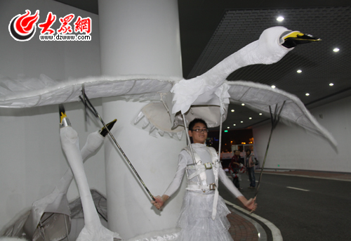 泰山崛起節目中,扮演天鵝的道具演員給本網記者演示動作