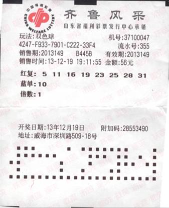 12月23日雙色球3億元派獎(jiǎng)“獎(jiǎng)上獎(jiǎng)”活動(dòng)第九周抽獎(jiǎng),本周抽獎(jiǎng)分別對(duì)雙色球2013148期、2013149期和2013150期滿足抽獎(jiǎng)條件的彩票進(jìn)行抽獎(jiǎng)。威海市有3名幸運(yùn)彩友中得4000元“獎(jiǎng)上獎(jiǎng)”山東一卡通一張。12月24日,其中一位中獎(jiǎng)彩友,在位于威海市深圳路509-18號(hào)的37100047號(hào)站點(diǎn)中獎(jiǎng)的,流水號(hào)為355、第2013149期雙色球的中獎(jiǎng)彩友來到市福彩中心兌獎(jiǎng)。
