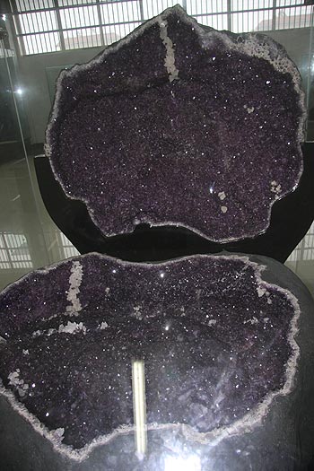 產自于烏拉圭的巨型紫水晶洞長3米,高2.2米,厚1.8米,重達13噸,經“吉尼斯”英國總部認證,已于2008年10月26日被載入吉尼斯世界紀錄。產自新疆奇臺的硅化木王,全長38米,是當今極為罕見的巨型化石,為目前世界上最長的硅化木,于2007年9月載入吉尼斯世界紀錄。還有2006年被歐洲《礦物寶石標本》雜志評為年度十佳的新疆西瓜碧璽,產于中國水晶之鄉——— 江蘇東海的重3.9噸的水晶單晶體為亞洲之最;重達45.74克拉的蒙山二號鉆石;世界最大的被命名為“春回大地”綠螢石,形成于2.8億年前的地下,重約1.5噸;呈放射狀的祖母綠寶石原礦石等等,無不讓人大開眼界。