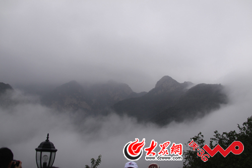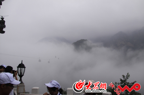 22日下午5點(diǎn)半,雨后泰山突現(xiàn)云山奇觀,泰山之巔遠(yuǎn)遠(yuǎn)望去,黑壓壓的云層像大山一般氣勢,而索道上的纜車更像穿梭于大山之中。