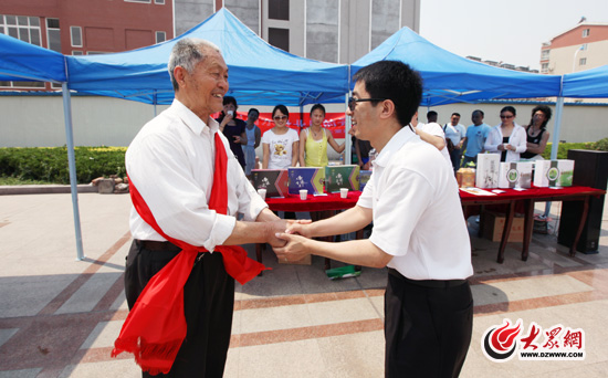 四川省自然天堂茶業(yè)有限公司總經(jīng)理何勇強(qiáng)(右)給濟(jì)南西郊的76歲老人黃伯安獻(xiàn)上羌紅