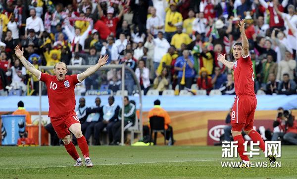 6月27日,英格蘭隊球員蘭帕德(右)進球后與隊友魯尼慶祝,但隨后這粒進球被判無效。當日,在布隆方丹進行的2010南非世界杯八分之一決賽中,英格蘭隊1比4不敵德國隊。新華社/法新