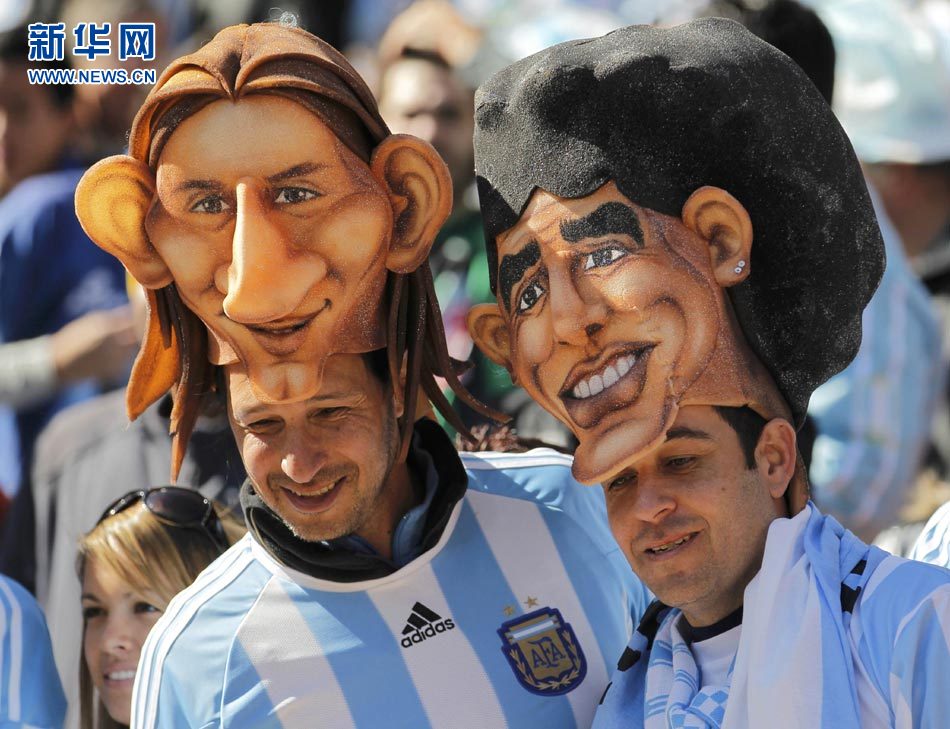 10號,在足球場上代表著球隊的靈魂和核心。馬拉多納是阿根廷歷史上最富盛名的10號球員,他在1986年墨西哥世界杯上帶領藍白軍團最終捧起大力神杯。20多年后,身為阿根廷隊主教練的他將10號球衣交給了梅西,而梅西沒有讓馬拉多納失望,他用自己一次次出色的表現回報了馬拉多納的信任。兩個10號,兩個男人。他們是如此的相似,帶著10號的魔力馳騁綠茵,為阿根廷隊建功立業;他們又是如此不同,一個性格桀驁不馴,霸氣十足,一個性格內斂,靦腆羞澀。常常同時出現在本屆世界杯綠茵場上的他們似乎在向人們昭示著10號精神的傳承——梅西接過馬拉多納的衣缽,正在續寫阿根廷國家隊的輝煌。這是2010年6月17日,球迷戴著畫有馬拉多納和梅西面孔的頭飾等待阿根廷隊與韓國隊的小組賽開始。 新華社發