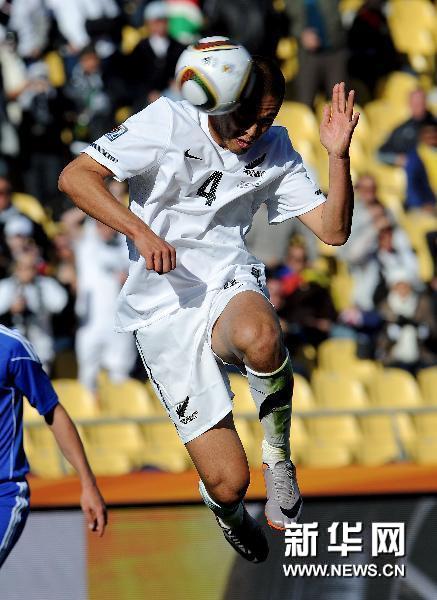 6月15日,新西蘭隊球員溫斯頓·里德頭球攻入扳平一球。當日,在南非勒斯滕堡舉行的世界杯足球賽F組比賽中,新西蘭隊以1比1戰平斯洛伐克隊。新華社記者王毓國攝