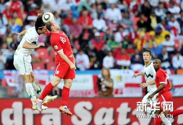 6月23日,英格蘭隊球員魯尼(左二)與斯洛文尼亞隊球員爭頂。當日,在伊麗莎白港的曼德拉灣球場舉行的南非世界杯C組第三輪的比賽中,英格蘭隊1比0戰勝斯洛文尼亞隊。新華社記者楊磊攝