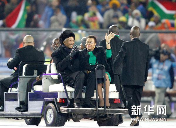 曼德拉在他的妻子陪伴下,乘坐一輛小型的敞篷車現身賽場,微笑著向現場觀眾揮手致意,引來數萬名觀眾的熱烈掌聲。這是曼德拉首度公開亮相本屆杯賽。