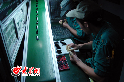 在歌爾的生產(chǎn)車(chē)間,工作人員在密閉的工作間內(nèi)制作電子元件。