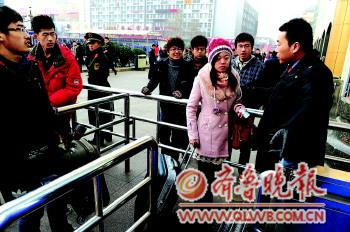 6日,濟(jì)南火車站實(shí)施進(jìn)站乘車100%實(shí)名驗(yàn)票制,票證信息不符將被拒絕進(jìn)站。圖為一名女乘客因信息不符被擋在站外。 本報(bào)記者 周青先 攝