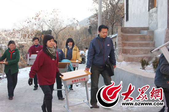 志愿者張軍(右)將公司捐獻(xiàn)的新課桌送到濟(jì)南劉家慈安小學(xué)