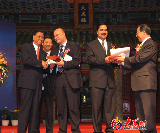 濟寧市副市長陳民向中央電視臺張仁平先生頒發(fā)孔子教育獎創(chuàng)意獎證書。