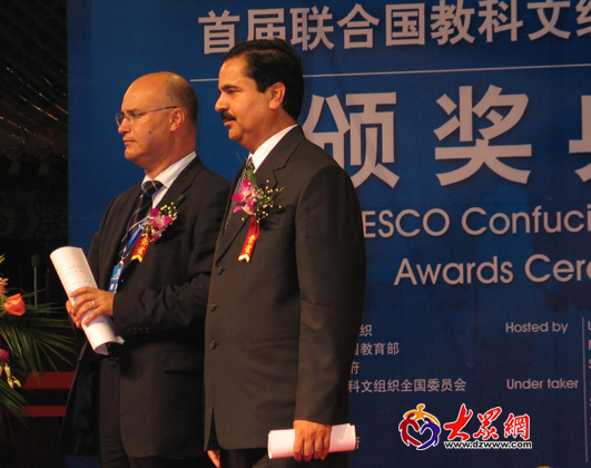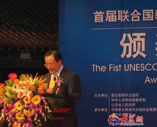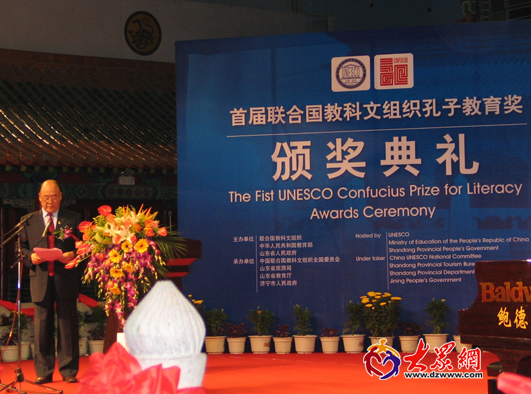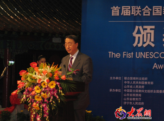 大眾網(wǎng)曲阜9月23日訊(記者 余梁)九月的古城曲阜秋風(fēng)送爽。今天下午,首屆聯(lián)合國教科文組織孔子教育獎頒獎盛典在曲阜六藝城大劇院隆重舉行。頒獎典禮由山東省政協(xié)副主席王久祜主持,聯(lián)合國教科文組織代表、副教育助理總干事唐虔宣布聯(lián)合國教科文組織表彰孔子教育獎獲獎?wù)邲Q定并致辭;全國政協(xié)常務(wù)副主席王忠禹和聯(lián)合國教科文組織代表、副教育助理總干事唐虔向獲獎代表頒獎;教育部副部長、聯(lián)合國教科文組織執(zhí)行局主席章新勝,山東省副省長李玉妹先后致辭;孔子教育獎獲獎代表、摩洛哥教育部國務(wù)秘書阿尼斯·畢魯,印度拉賈斯坦邦識字和繼續(xù)教育部主任蘇可拉發(fā)表了獲獎感言。