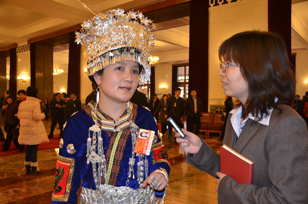 2011年3月5日,第十一屆全國(guó)人民代表大會(huì)第四次會(huì)議在人民大會(huì)堂開(kāi)幕。圖為全國(guó)人大代表李小燕接受記者采訪。蘇影攝