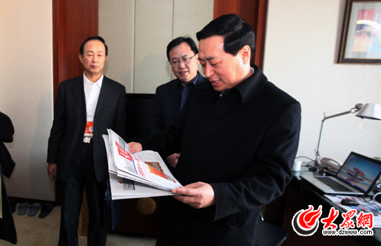 3月11日上午,山東省委常委、宣傳部長孫守剛翻閱當天出版的《大眾日報》。 (特派記者 曹亮 攝)
