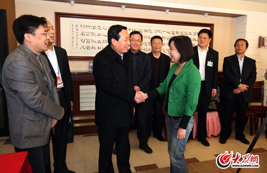 3月11日上午,山東省委常委、宣傳部長孫守剛在大眾報業集團“兩報一網”直播室與大眾網記者親切握手。 (特派記者 曹亮 攝)