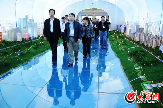 山東網絡文化辦公室主任劉致福、臨沂市委宣傳部副部長劉廣闊陪同采訪團參觀規劃展覽館。(攝影 燕雨)