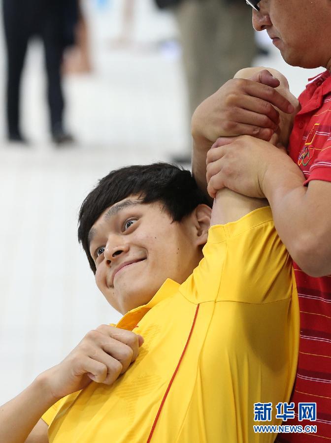 7月31日,孫楊(下)在工作人員的協助下熱身。當日,倫敦奧運會游泳比賽在奧林匹克公園水上中心繼續進行。 新華社記者凡軍攝