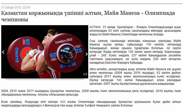 繼祖爾菲亞奪冠后,麥亞也拿到了金牌。哈薩克斯坦國內一片歡騰。該國媒體認為她們的表現鑄就了哈薩克斯坦舉重乃至全國體育的輝煌。要知道在北京奧運會上,哈薩克斯坦總共只拿到兩塊金牌,而且全部是男子項目。此番祖爾菲亞和麥亞雙雙發威,讓哈薩克斯坦女子舉重隊一炮走紅。