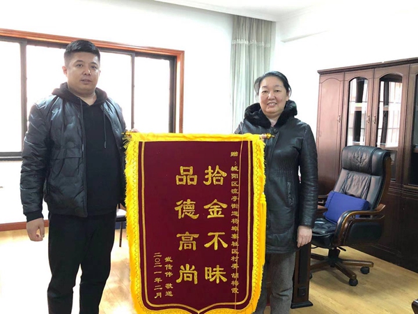 2021年2月25日,武先生來到青島市城陽區流亭街道楊埠寨社區居委會,將一面寫著“拾金不昧 品德高尚”的錦旗交給了楊埠寨社區工作人員胡梅霞。胡梅霞怎么也沒想到,自己做了一件看起來微不足道的事情,卻被人送了一面錦旗。