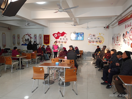 宋玉芬(中)在“暖心食堂”開展“餐前一刻鐘”為老人宣傳黨的富民政策