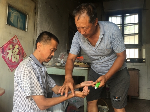 今年50歲的于春海,從生下的那一天起,生活便是無比的簡單,由于遺傳和治療不及時(shí)的緣故,于春海的智力一直停留在一個2、3歲的小孩子水平,缺乏對生活最基本的認(rèn)知,除了吃飯之外,日常生活基本離不開人的照顧。每天就是吃飯和坐著,同時(shí),還患有嚴(yán)重的皮膚病和乙肝,需要藥物治療。而在劉明舉的生活里,除了日常工作之外,便只剩下陪伴著于春海。于春海全身患有嚴(yán)重的皮膚病,需要藥物治療。前幾年家庭生活比較拮據(jù),劉明舉求爺爺告奶奶,向別人求到了對于一般家庭還是很廉價(jià)的治療皮膚病的藥物,每天幫于春海進(jìn)行全身的涂抹。不管嚴(yán)寒酷暑,兩個人都要坐在家里為了“涂藥”這個事進(jìn)行一番抗?fàn)帯S捎谄つw病,每次涂藥的時(shí)候,于春海都因?yàn)槠つw接觸而疼得發(fā)狂。隨著歲數(shù)的增長,劉明舉越來越感到力不從心,每到劉明舉無法將于春明按住的時(shí)候,兩個大老爺們便抱在一起哭一會兒,你埋怨我一陣,我罵你一陣,然后等疼痛消弭之后繼續(xù)下一輪的抗?fàn)帲@一抹便是20多年。