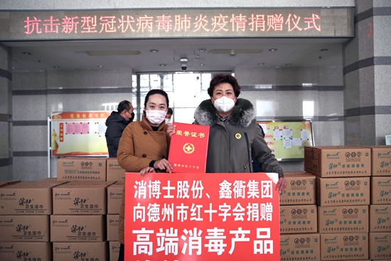 疫情期間,山東消博士公司先后7次向新疆生產建設兵團、山東預備役保障旅、山東省紅十字會、廣州海關、駐德空軍某部、德州市紅十字會等單位捐贈多批醫用消毒物資,捐助物資總價值近100萬元。用實際行動積極踐行了作為國內知名高端消毒產品制造企業的使命與擔當。