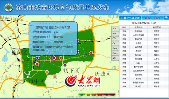 今天下午,記者通過查看濟南市城市環境空氣質量發布平臺發現,在全市15個監測點最近24小時的AQI數據中,市區有8個監測點的空氣質量等級達到了“重度污染”,僅有跑馬嶺1個監測點空氣質量達到了“良”,其余6個監測點為“輕度污染”或“中度污染”。