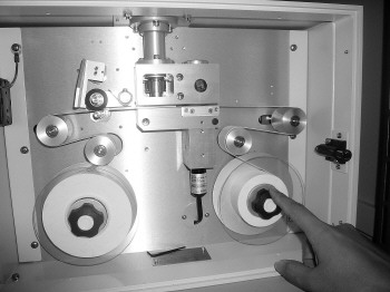 ▲設(shè)備里的紙帶上每隔一小時(shí)就會(huì)打上一個(gè)黑點(diǎn),就能分析出這一個(gè)小時(shí)里空氣PM2.5的濃度。 (記者 李萌博 攝)