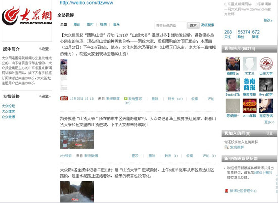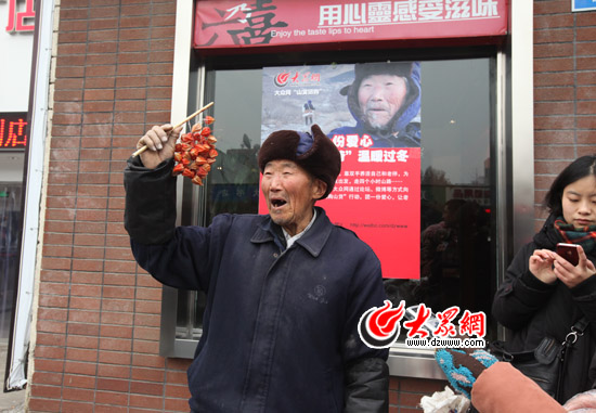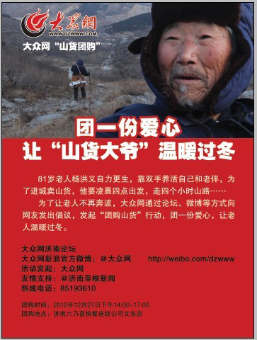 近日, 大眾網(wǎng)連續(xù)報(bào)道81歲“山貨大爺”步行40里山路進(jìn)城賣山貨的消息,引起了網(wǎng)友的熱烈關(guān)注。在第一次去老人家的采訪中,大眾網(wǎng)記者了解到,老人家里還有300多斤柿餅和一些花椒、山楂片等山貨,老人說從現(xiàn)在起到春節(jié)前后,希望把這些山貨慢慢賣完,賣完了不用那么頻繁地走40里山路進(jìn)城了。為了能讓老人早日賣光家里的山貨,不再遭受奔波之苦,大眾網(wǎng)發(fā)起了“團(tuán)購山貨”行動(dòng),團(tuán)一份愛心,讓老人溫暖過冬。