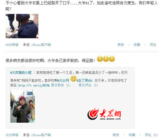 大眾網(wǎng)對團(tuán)購全程進(jìn)行了微博直播,關(guān)注此事的網(wǎng)友不斷留言。“很多網(wǎng)友都說很好吃啊,大爺自己親手做的,保證甜!”在微博中,網(wǎng)友“大濟(jì)南的小妮 ”說,我和我媽吃了第一個(gè)之后,第一反映就是買少了,哇咔咔,真好吃啊。