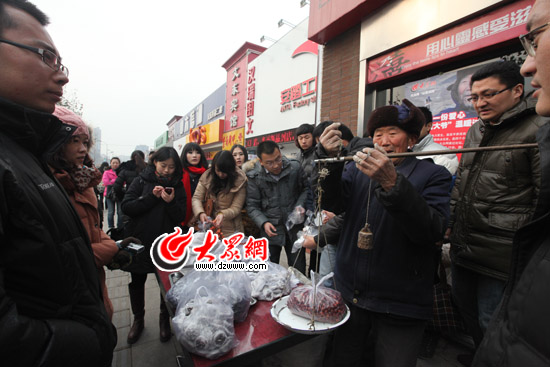 在文化東路六乃喜快餐店門口,大爺?shù)臄傋觿倓倲[上,就被過路的行人和特意前來的網(wǎng)友圍住了,大家紛紛上前購買“綠色山貨”,大眾網(wǎng)的五六位記者不斷地幫著大爺裝袋、收錢,過稱……盡管今天的氣溫很低,但大家不一會兒就忙出一身汗來。