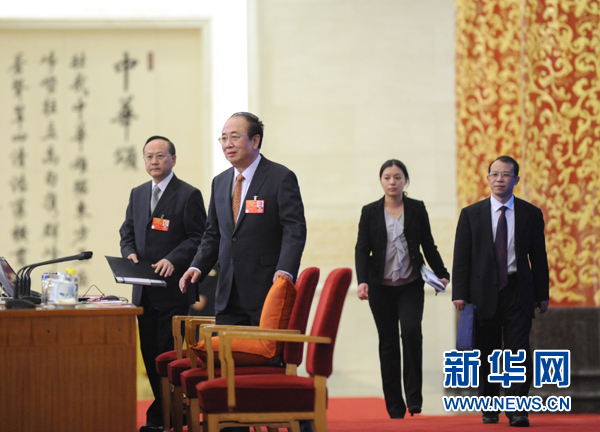 2012年3月2日15時,全國政協十一屆五次會議新聞發布會在人民大會堂三樓金色大廳召開,大會新聞發言人趙啟正向中外媒體介紹本次大會有關情況,并回答記者提問。圖為大會新聞發言人步入會場。