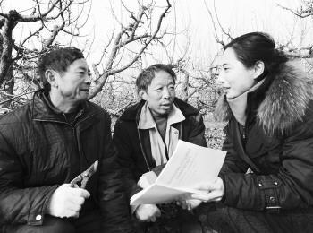 2012年12月12日,棗莊市山亭團(tuán)區(qū)委派駐店子鎮(zhèn)苑莊村“第一書記”高曉娟(右)在果園向農(nóng)民宣傳十八大精神。10多年了,黃溝村一直沒有黨員納新對(duì)象,村支部不健全,黨員活動(dòng)一年搞不了一次,一直是鎮(zhèn)里的三類落后班子。