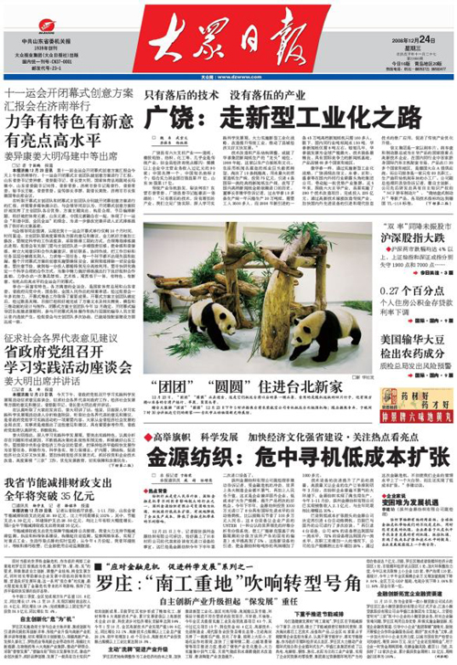 作為山東省委機關(guān)報,大眾日報在全省新聞輿論大合唱中充分發(fā)揮領(lǐng)唱的作用。2004年實施新一輪改版以來,以辦成在主流人群中有廣泛影響力的權(quán)威政經(jīng)大報為目標,堅持走“新聞強報、特色立報”的路子,實施重點區(qū)域、重點行業(yè)、重點企業(yè)、重點人群突破戰(zhàn)略,引領(lǐng)經(jīng)濟政治文化走向,影響最有影響力的人群。