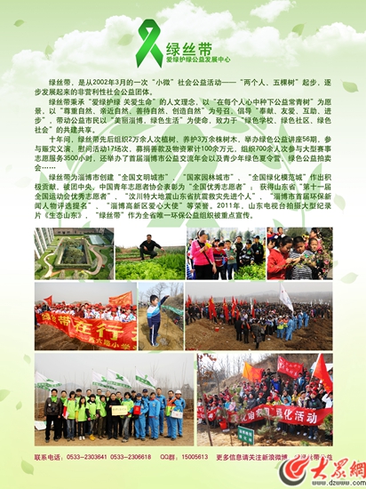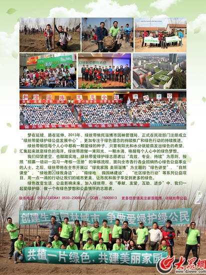 綠絲帶秉承“愛綠護(hù)綠?關(guān)愛生命”的人文理念,以“在每個人心中種下公益常青樹”為愿景,以“尊重自然、親近自然、善待自然、創(chuàng)造自然”為號召,倡導(dǎo)“奉獻(xiàn)、友愛、互助、進(jìn)步”,帶動公益市民以“美麗淄博,綠色生活”為使命,致力于“綠色學(xué)校、綠色社區(qū)、綠色社會”的共建共享。