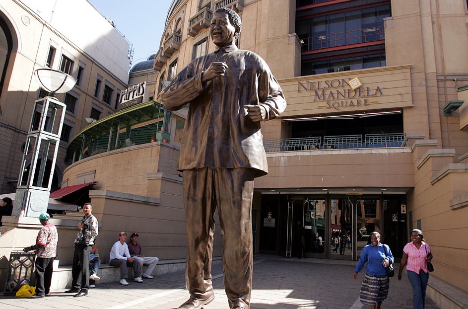 2004年3月底,高6米的曼德拉雕像在約翰內(nèi)斯堡桑敦商務(wù)中心廣場(chǎng)落成,此廣場(chǎng)也更名為曼德拉廣場(chǎng)。