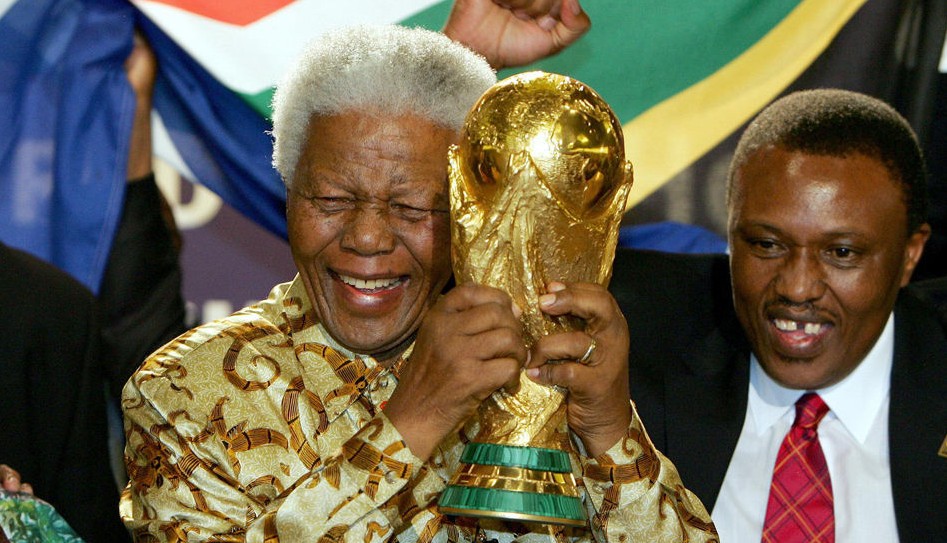 2004年5月16日,南非獲得2010年世界杯主辦權。時年85歲的曼德拉在眾人簇擁之下走上前臺,將大力神杯緊緊摟在懷里。據媒體分析,南非在最后時刻脫穎而出,很大程度上正是因為曼德拉以濃厚的感情打動了所有人的心,“當我被關在羅本島上的時候,我唯一接觸世界杯的方式就是收聽廣播,這也是我唯一的樂趣!甭吕眠@樣的話語詮釋了南非舉辦世界杯的決心,也最終讓世界杯第一次落戶非洲大陸。圖為當國際足聯宣布南非獲得世界杯主辦權時,曼德拉喜極而泣,將大力神杯緊緊摟在懷里。