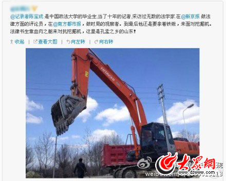被廣泛轉載的另一張“經典”圖片的場景為:陳寶成手拿鐵鍬,站在一個巨大的挖掘機下。有網友發微博稱:“陳寶成是中國政法大學的畢業生,當了十年的記者……到最后他還是要拿著鐵鍬來面對挖掘機。法律書生靠血肉之軀來對抗挖掘機。”